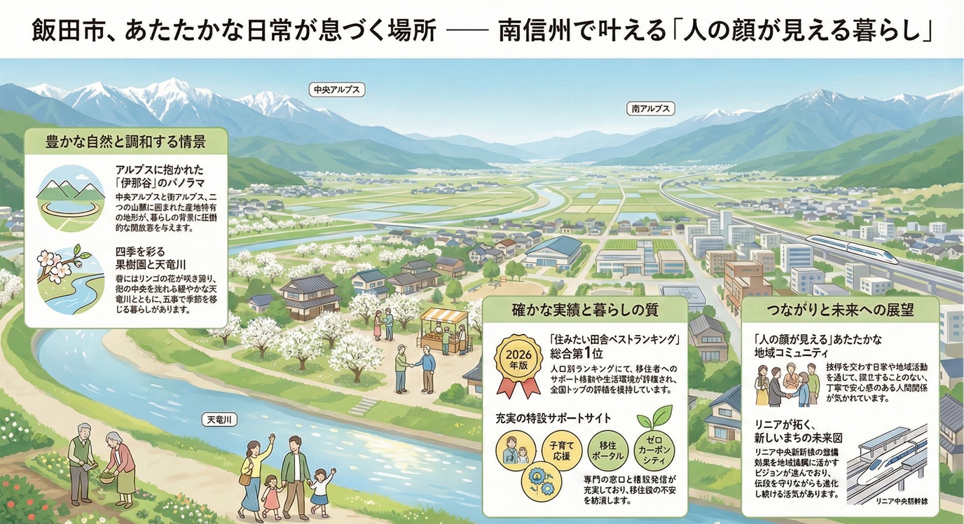 便利すぎず、田舎すぎない。静かだけれど、あたたかい。飯田市は、暮らしを見つめ直したい方、自然とともに新しい一歩を踏み出したい方に、そっと寄り添ってくれる場所かもしれません。